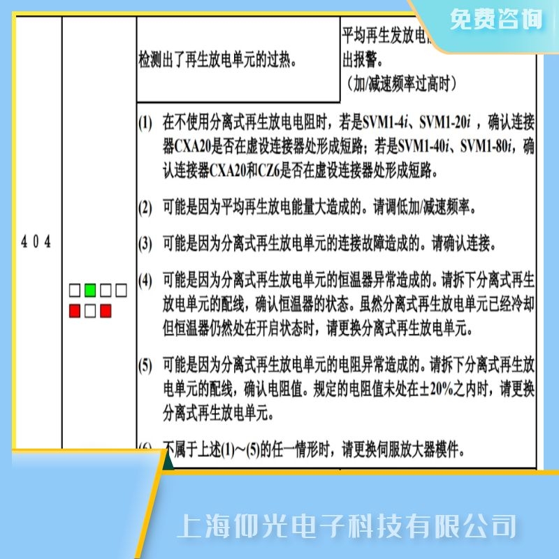 404 檢測出了再生放電單元的過熱。 平均再生發(fā)放電能量較大時,就會發(fā)出報警。 (加/減速頻率過高時)